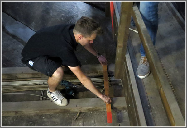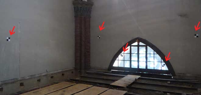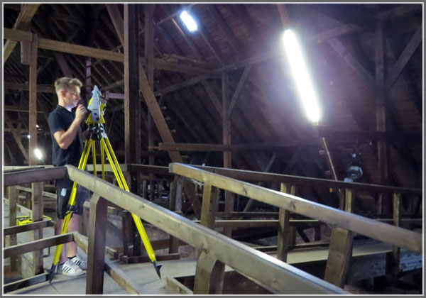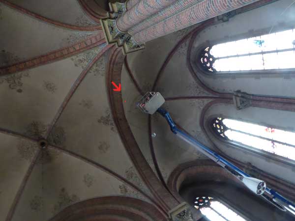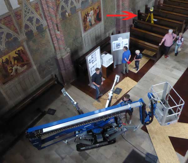 Am heutigen Tag haben Mitarbeiter der Firma "denkmal3d" notwendige Vermessungsarbeiten durchgeführt. Das Vorwerk der Walcker Orgel wird an Stahlträgern gehängt, die über dem Gewölbe platziert werden. Dazu müssten Löcher durch das Gewölbe gebohrt werden, durch die die Haltestangen des Vorwerks zu den Stahlträgern geführt werden. Bei den ersten Messungen galt es die exakten Positionen dieser Löcher zu ermitteln.