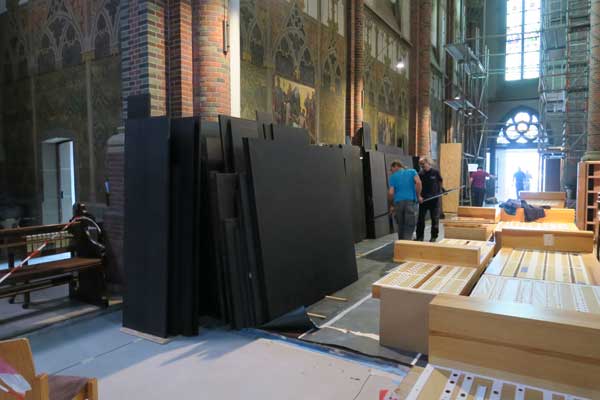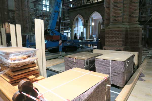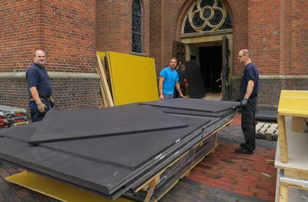 Ganze 800 Quadratmeter Verkleidungsplatten müssen per Hand-und Muskelkraft in den Kirchenraum geschafft werden.