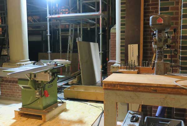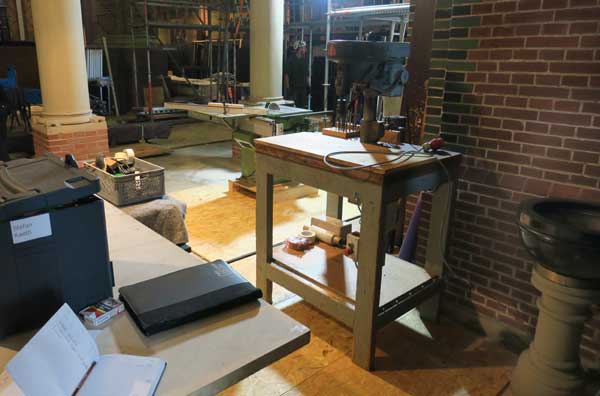 Neben dem Weihwasserbecken eine Werkbank mit Standbohrmaschine, im Hintergrund eine Kreissäge