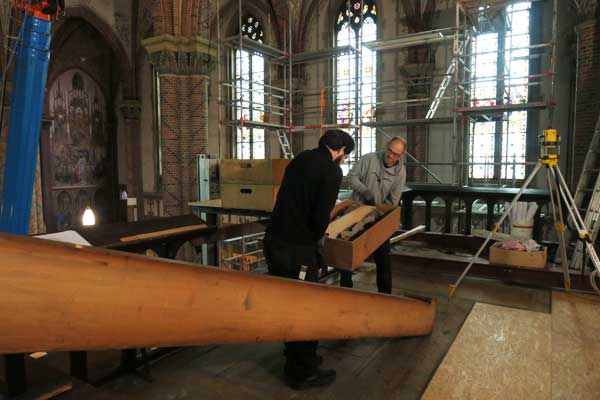 Materialkiste auf Materialkiste wird auf den Orgelboden gehieft