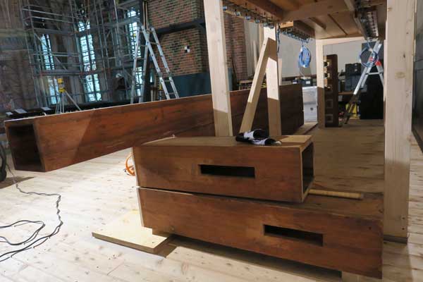 Diese großen, langen "Holzkästen" werden später alle in der großen Orgel ihren Tonbeitrag zur Musik leisten. Tiefe Töne brauchen viel Raum.